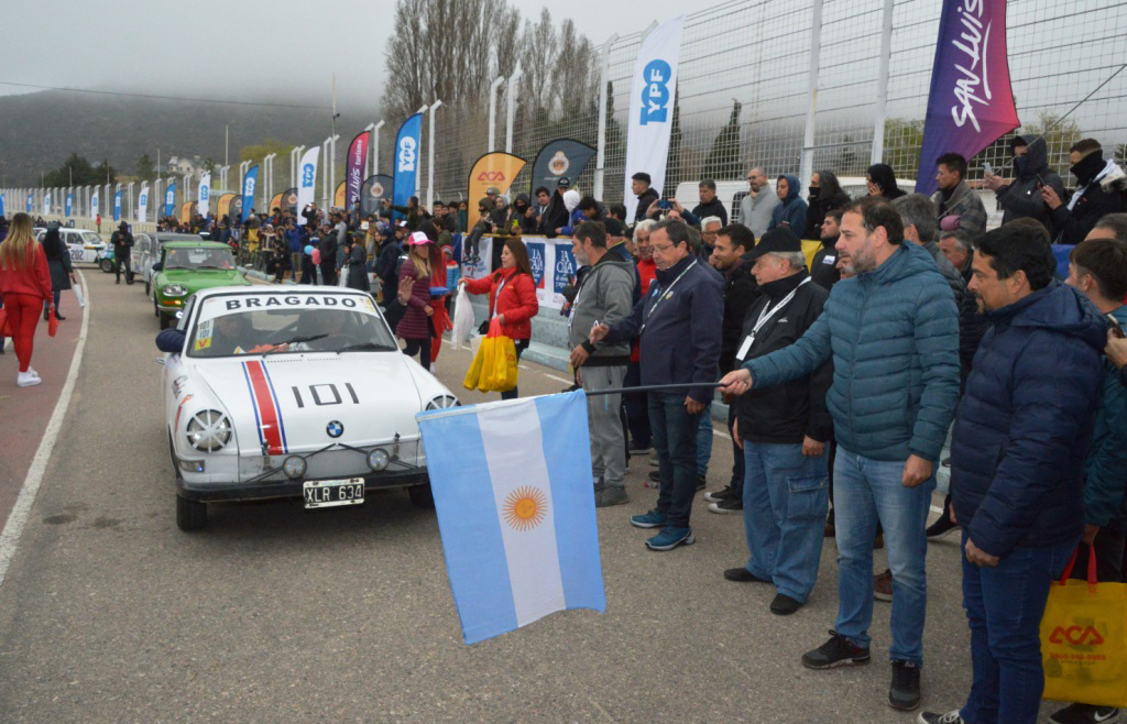 Jorge Revello -vicepresidente 2do. del ACA- y Luis Macagno- Secretario de Turismo de la provincia de San Luis-, luego de la entrega de placas que hiciera el ACA hacia el Secretario de Turismo de San Luis y al Intendente de Potrero de los Funes, Damián Gómez, ayer domingo, dieron partida bandera en mano a 104 hermosas máquinas en excelente estado de conservación que pugnaran por quedarse con la copa YPF 100 años “impulsando lo nuestro”. Entre ellas prevalecen los de marca Peugeot con 27 unidades, de las cuales 21 son del popular 404, modelo que es el máximo vencedor en esta competencia.