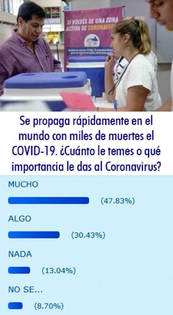 Veamos la encuesta semanal que publicamos en nuestro portal de noticias. Veamos con sus resultados ya puestos de quienes participaron dejando su opinión. Los mismos dicen que casi un 50 por ciento (47,83%) de los ciudadanos que optaron por participar, le dan gran importancia al Coronavirus.