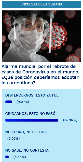 Ahora bien, creemos que si le preguntásemos a quienes votaron nuestra encuesta, si estarían dispuestos a que nuevamente nos encierren; segura y absolutamente dirían que no, aunque afirme el 86,36% con lo que se votó en la semana, que hay que cuidarnos porque esto aún no pasó.