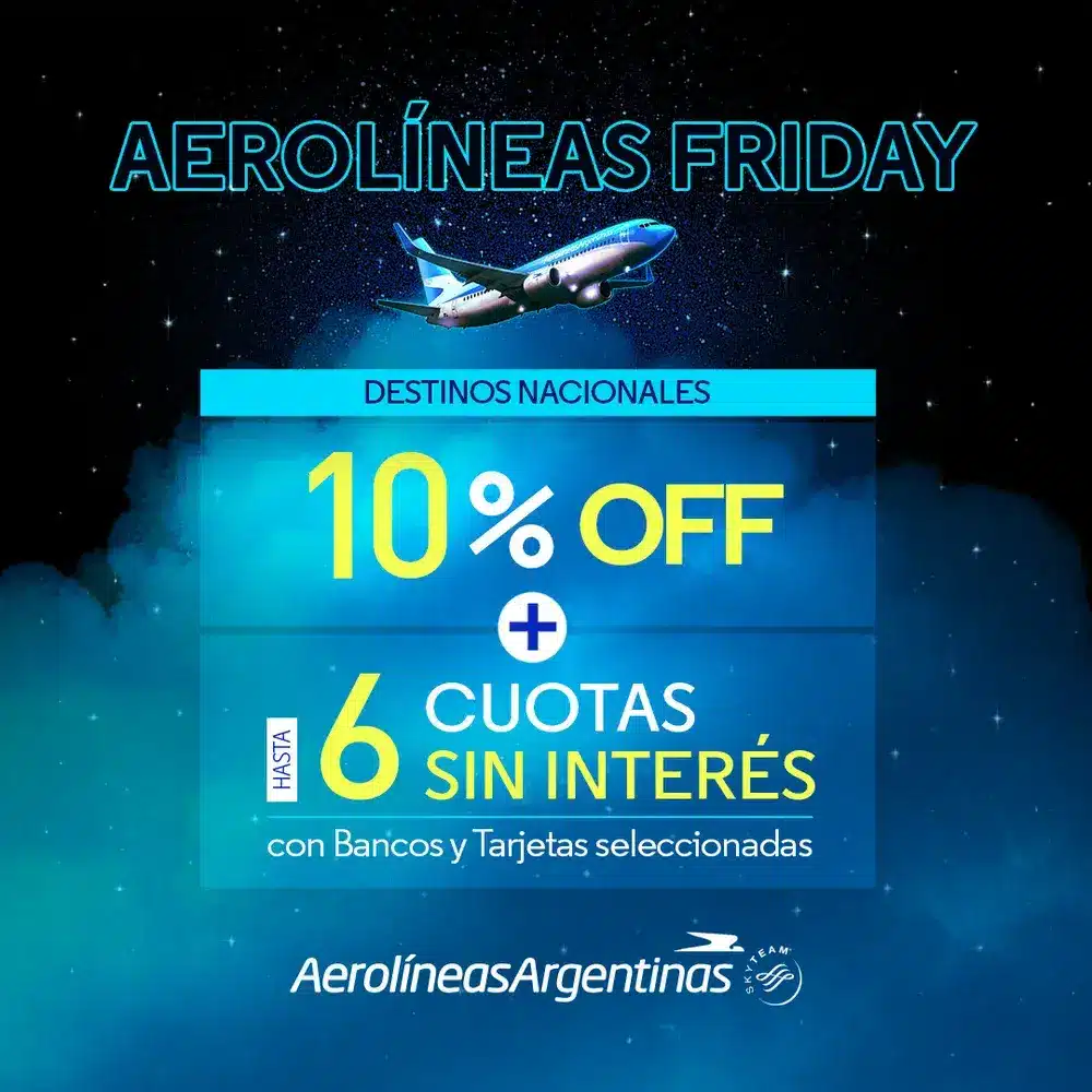 La aerolínea de bandera presentó “Aerolíneas Friday”, una propuesta comercial con “beneficios exclusivos” para viajar dentro del país. Según se informó, la promoción estará vigente desde este jueves hasta el domingo 30 de noviembre. Incluye 10% de descuento en destinos nacionales y la posibilidad de financiar las compras en hasta 6 cuotas sin interés con todos los bancos.