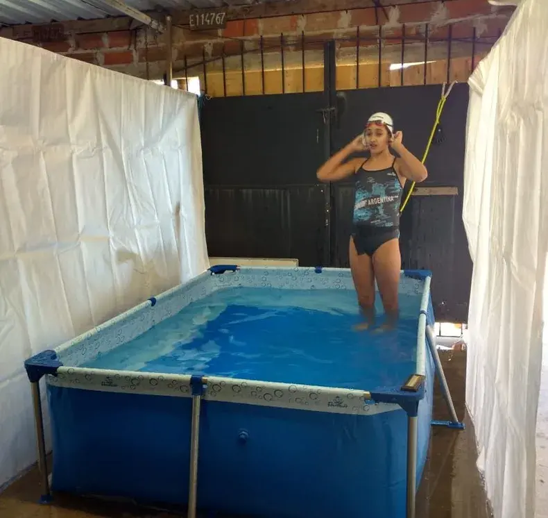 Tenía doce años cuando la pandemia se interpuso en su exitosa carrera en la natación. Con los clubes cerrados y sin competencias, Agostina tuvo que entrenar en casa en una pileta de lona, gracias a un arnés y un cable atado a una pared.
