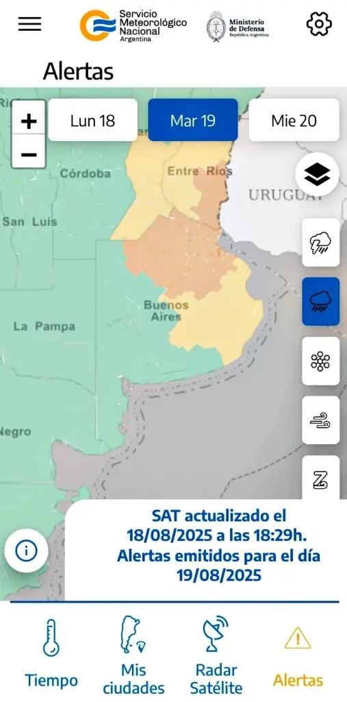 El Servicio Meteorológico Nacional actualizó las alertas por fuertes lluvias y ráfagas de viento que afectarán al norte y centro de la provincia de Buenos Aires en las próximas horas y hasta el miércoles.