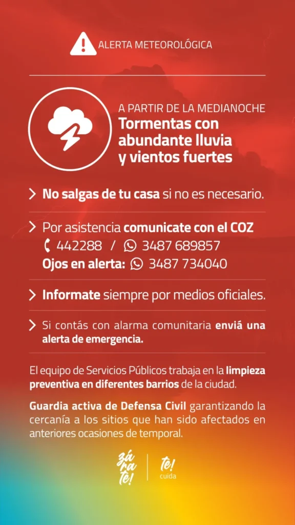 Detalles del fenómeno indican en Zárate “Tormentas de variada intensidad, algunas localmente fuertes. – Posible actividad eléctrica, ráfagas de viento y ocasional caída de granizo. – Abundante precipitación en cortos períodos, con lluvias de intensidad fuerte durante la tarde. – Se estima una acumulación de agua entre 70 y 80 mm, con posibilidad de superar esos valores en forma puntual” se actualizará hoy 19.00.