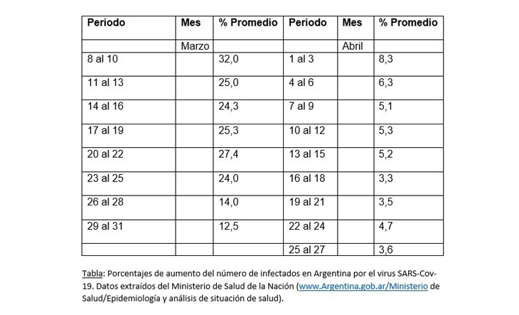 “Para este análisis, se han analizado los porcentajes de aumento para el período que va del 8 de marzo al 21 de abril”, comentó Cozza Buccaro a la Agencia CTyS-UNLaM. E indicó: “Los porcentajes se han tomado promediando en grupos cada tres días, para tener en cuenta la variabilidad que puede haber día a día en el manejo de las muestras y la entrega de resultados”.
