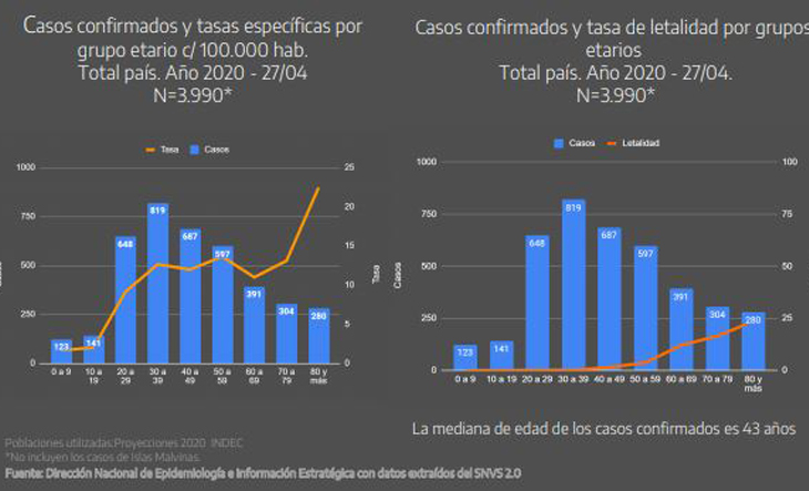La curva parece estancarse en valores similares entre el 5,1 al 5,3 por ciento por una semana más, para luego evidenciar otro descenso. Según explicó el docente, “la reducción del 24 por ciento en el período 23 al 25 de marzo al 14 por ciento del 26 al 28 de marzo coincide con el establecimiento del Aislamiento Social Preventivo y Obligatorio, puesto que la infección con el virus se produce aproximadamente unos siete días antes a la aparición en el reporte”.