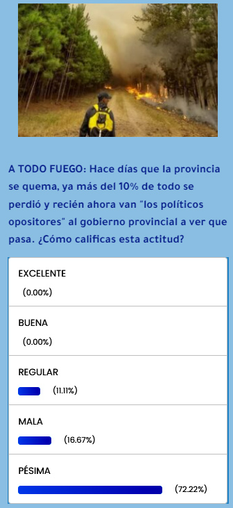 La encuesta de la semana es más que elocuente, habla por sí sola, no debemos agregar ni una palabra. Así votaron nuestros ciberlectores -que son sabios-, la postura del Gobierno Nacional ante el incendio correntino.