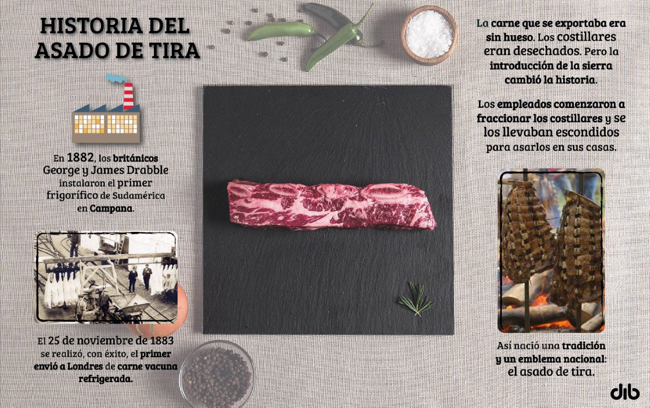 El asado de tira es el corte más popular de la Argentina, pero no siempre fue así: una innovación tecnológica, y algo de picardía y necesidad allanaron el camino para que, con los años, se convirtiera en el favorito de la parrilla nacional. Es un invento bonaerense. Nació en la localidad de Campana, donde se instaló el primer frigorífico de Sudamérica. Una innovación tecnológica lo convirtió en emblema nacional.