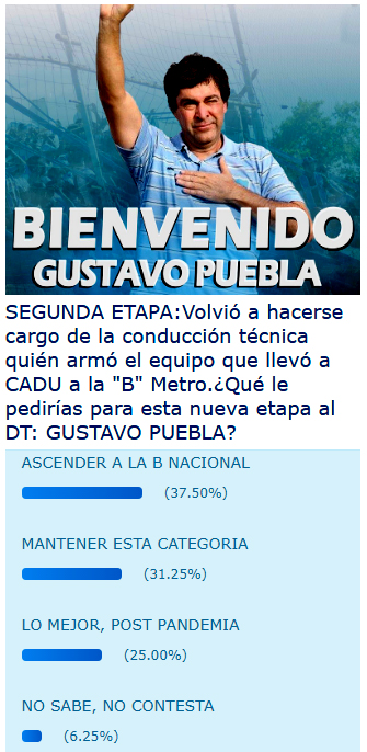 Y la encuesta de la semana, la que pusimos a su consideración, lo afirma. Mirá. SEGUNDA ETAPA: Volvió a hacerse cargo de la conducción técnica quién armó el equipo que llevó a CADU a la “B” Metro. ¿Qué le pedirías para esta nueva etapa al DT?