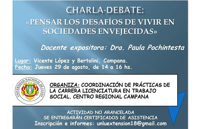 “Pensar los desafíos de vivir en sociedades envejecidas” se denomina la propuesta que es impulsada por la Coordinación Prácticas de Formación Profesional de la Carrera de Trabajo Social, a cargo del Lic. Matías Martínez Reina. El próximo jueves 29 de agosto, en las instalaciones del Centro Regional Campana de la Universidad Nacional de Luján (UNLu), se realizará una charla-debate sobre la temática vejez. La misma es abierta a la comunidad y estará a cargo de la Dra. Paula Pochintesta, docente del Departamento de Ciencias Sociales de la casa de altos estudios y especialista en la temática.