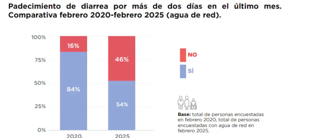 Según evaluaron los autores del informe, la mejora en el acceso al agua refleja un avance en criterios técnicos y logísticos y un profundo impacto social y sanitario sobre las comunidades implicadas. Desde 2020, la prevalencia de enfermedades como la diarrea ha disminuido de manera significativa, situándose en un 54% en 2025 entre quienes consumen agua de red, cuando en 2020 se ubicaba en el 84%; y aún más bajo, en un 22%, entre quienes utilizan el agua suministrada por Cruz Roja.
