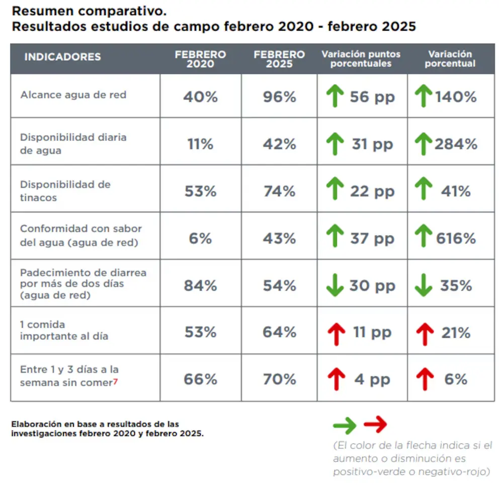 Según el informe, uno de los logros más destacados es la expansión de la cobertura de agua de red. En febrero de 2025, el acceso al agua de red había aumentado notablemente, con un 96% de población incluida, lo cual representa un incremento de más del doble en comparación con el estado inicial en 2020. Este avance fue atribuido por el relevamiento a la extensión de la infraestructura y a las intervenciones directas de la Cruz Roja, incluyendo la distribución de tanques de almacenamiento y filtros de agua, elementos fundamentales que han permitido mejorar significativamente la resiliencia de la comunidad frente a problemas de desabastecimiento.