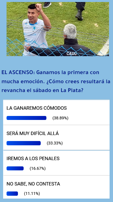 Por eso preguntamos en la Encuesta de la Semana y ha ganado por muy poco, con el 38,89% “será fácil”; mientras que el 33,33% dice que “no será fácil”, solo un 16,67% se inclina por la definición desde el punto penal por un empate en la sumatoria de los 180 minutos, recordemos que agónicamente aquí en casa en tiempo de descuento les ganamos el domingo pasado 2 a 1, y no sabe no contesta solo una persona de cada 10 en Zárate, no le interesa el tema o lo desconoce.