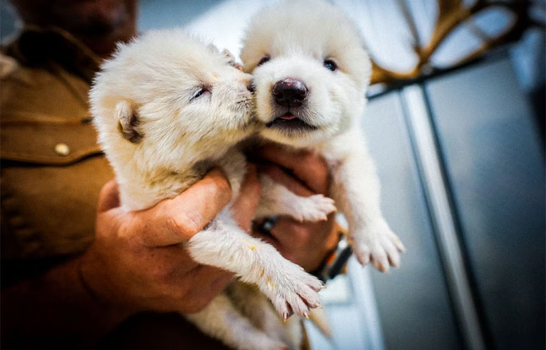 Un investigador sostiene a Rómulo y Remo, dos cachorros de lobo con genes de lobo terrible (Colossal)