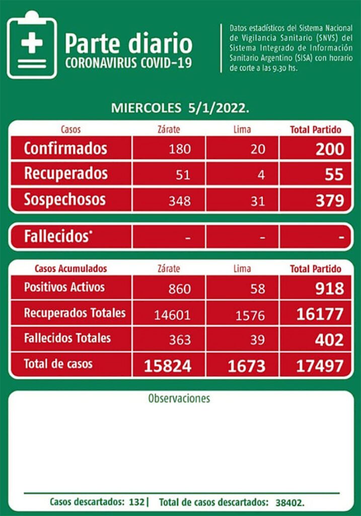 El parte diario del miércoles 05 de enero 2022, que entrega el Municipio de Zárate a través de la Secretaría de Salud, en base a las estadísticas del Sistema Nacional de Vigilancia Sanitario (SNVS) ha comunicado que tuvimos “200 casos positivos de COVID-19”, hubo “55 recuperados” y también un total de “379 potenciales nuevos casos sospechosos”. Sin fallecidos.