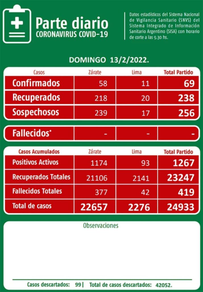 El parte diario del sábado 13 de febrero 2022, que entrega el Municipio de Zárate a través de la Secretaría de Salud, en base a las estadísticas del Sistema Nacional de Vigilancia Sanitario (SNVS) dice que tuvimos “69 casos positivos de COVID-19”, hubo “238 recuperados” y “256 nuevos casos sospechosos”. Con 0 decesos, con diferencia en relación a lo informado oficialmente por el Gobierno Nacional de 422 fallecidos con 3 menos en Zárate, y también 336 menos casos positivos zarateños declarados.