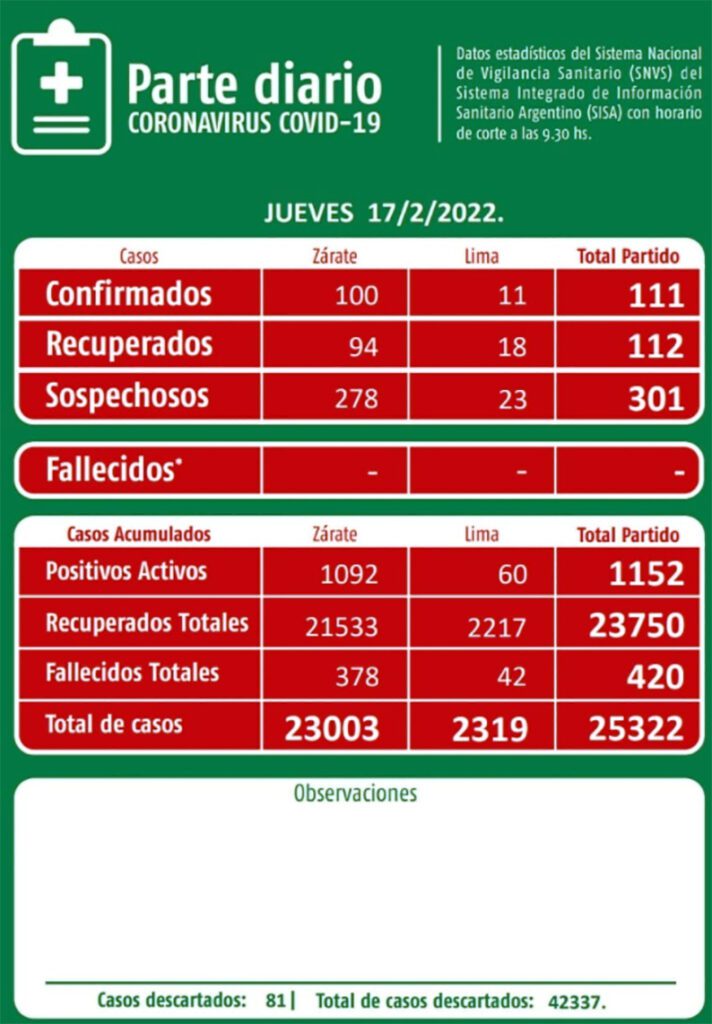 El parte diario del jueves 17 de febrero 2022, que entrega el Municipio de Zárate a través de la Secretaría de Salud, en base a las estadísticas del Sistema Nacional de Vigilancia Sanitario (SNVS) dice que tuvimos “111 casos positivos de COVID-19”, hubo “112 recuperados” y “301 nuevos casos sospechosos”. Con 0 deceso, con diferencia en relación a lo informado oficialmente por el Gobierno Nacional de 424 fallecidos con 4 menos en Zárate, y también 287 menos casos positivos zarateños declarados.