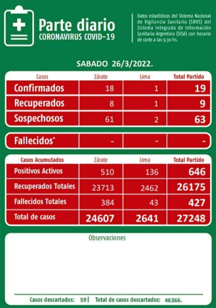 El parte diario del sábado 26 de marzo 2022, que entrega el Municipio de Zárate a través de la Secretaría de Salud, en base a las estadísticas del Sistema Nacional de Vigilancia Sanitario (SNVS) dice que tuvimos “19 casos positivos de COVID-19”, hubo “9 recuperados” y “63 nuevos casos sospechosos”. Con 0 decesos y, con diferencia en relación a lo informado oficialmente por el Gobierno Nacional de 432 fallecidos contra 427, con 5 menos en Zárate, y también 284 casos positivos zarateños, no declarados localmente.