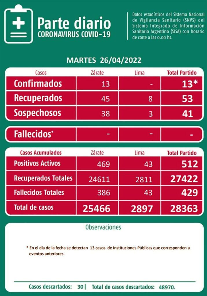 El parte diario del martes 26 de abril 2022, que entrega el Municipio de Zárate a través de la Secretaría de Salud, en base a las estadísticas del Sistema Nacional de Vigilancia Sanitario (SNVS) dice que tuvimos “13 casos positivos de COVID-19” todos “descubiertos somo perdidos”, hubo “53 recuperados” y “41 nuevos casos sospechosos”. Con 0 decesos, se mantiene la diferencia en relación a lo informado oficialmente por el Gobierno Nacional con los 434 fallecidos contra 429, con 5 menos en Zárate, y también 259 casos positivos, no declarados localmente.