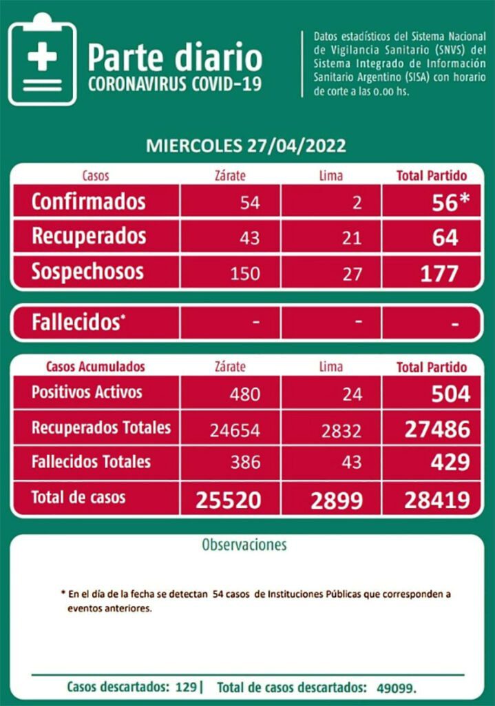 El parte diario del miércoles 27 de abril 2022, que entrega el Municipio de Zárate a través de la Secretaría de Salud, en base a las estadísticas del Sistema Nacional de Vigilancia Sanitario (SNVS) dice que tuvimos “56 casos positivos de COVID-19” de los cuales 54 fueron “descubiertos como perdidos”, hubo “64 recuperados” y “177 nuevos casos sospechosos”. Con 0 decesos, se mantiene la diferencia en relación a lo informado oficialmente por el Gobierno Nacional con los 434 fallecidos contra 429, con 5 menos en Zárate, y también 216 casos positivos, no declarados localmente.