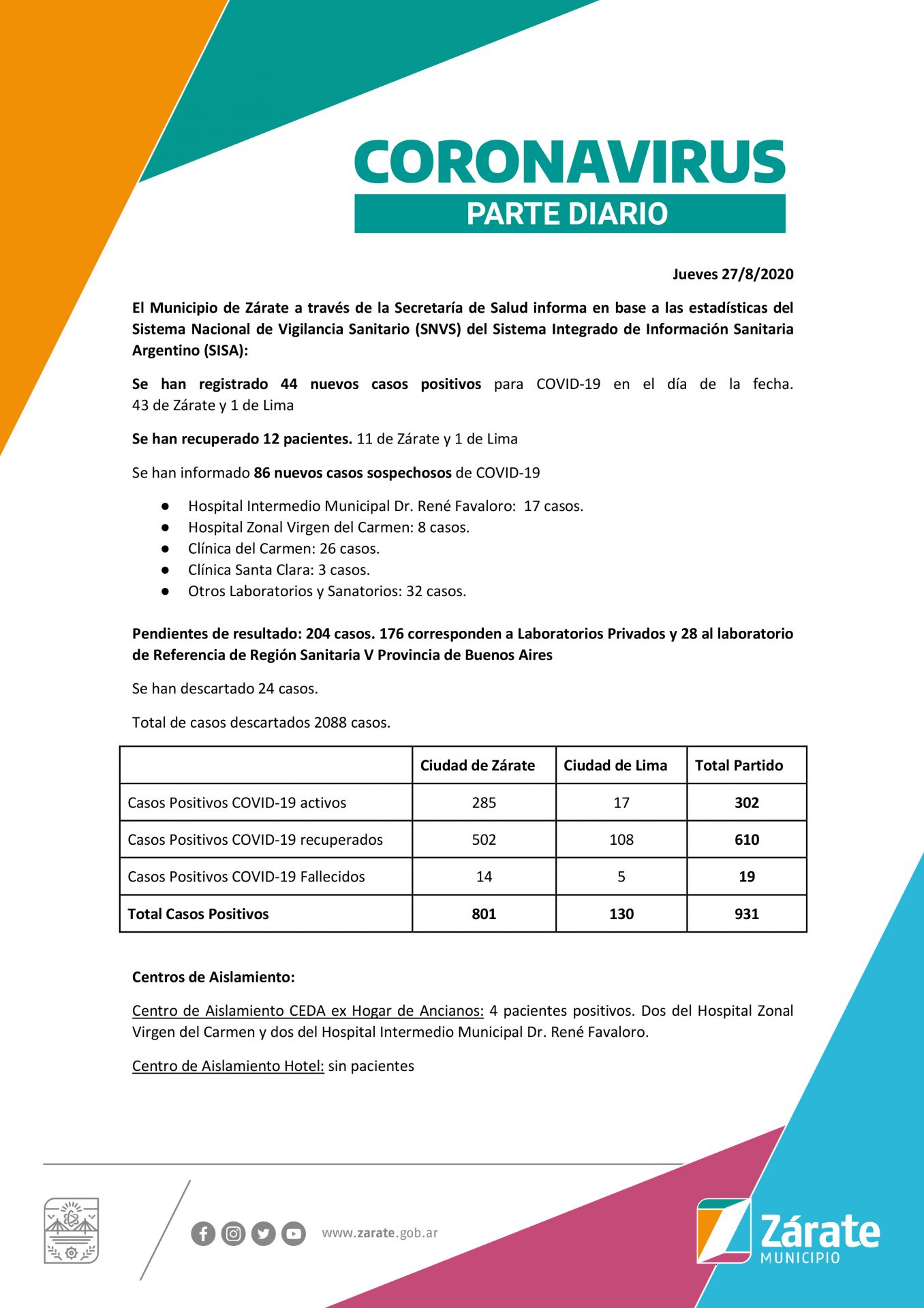 El informe oficial de este jueves 27 de agosto que emite el Municipio de Zárate a través de la Secretaría de Salud informa en base a las estadísticas del Sistema Nacional de Vigilancia Sanitario (SNVS), dio parte de que “Se han registrado 44 nuevos casos positivos para COVID-19” que se han “recuperado 12 pacientes” habiéndose confirmado “86 nuevos casos sospechosos” de Coronavirus.