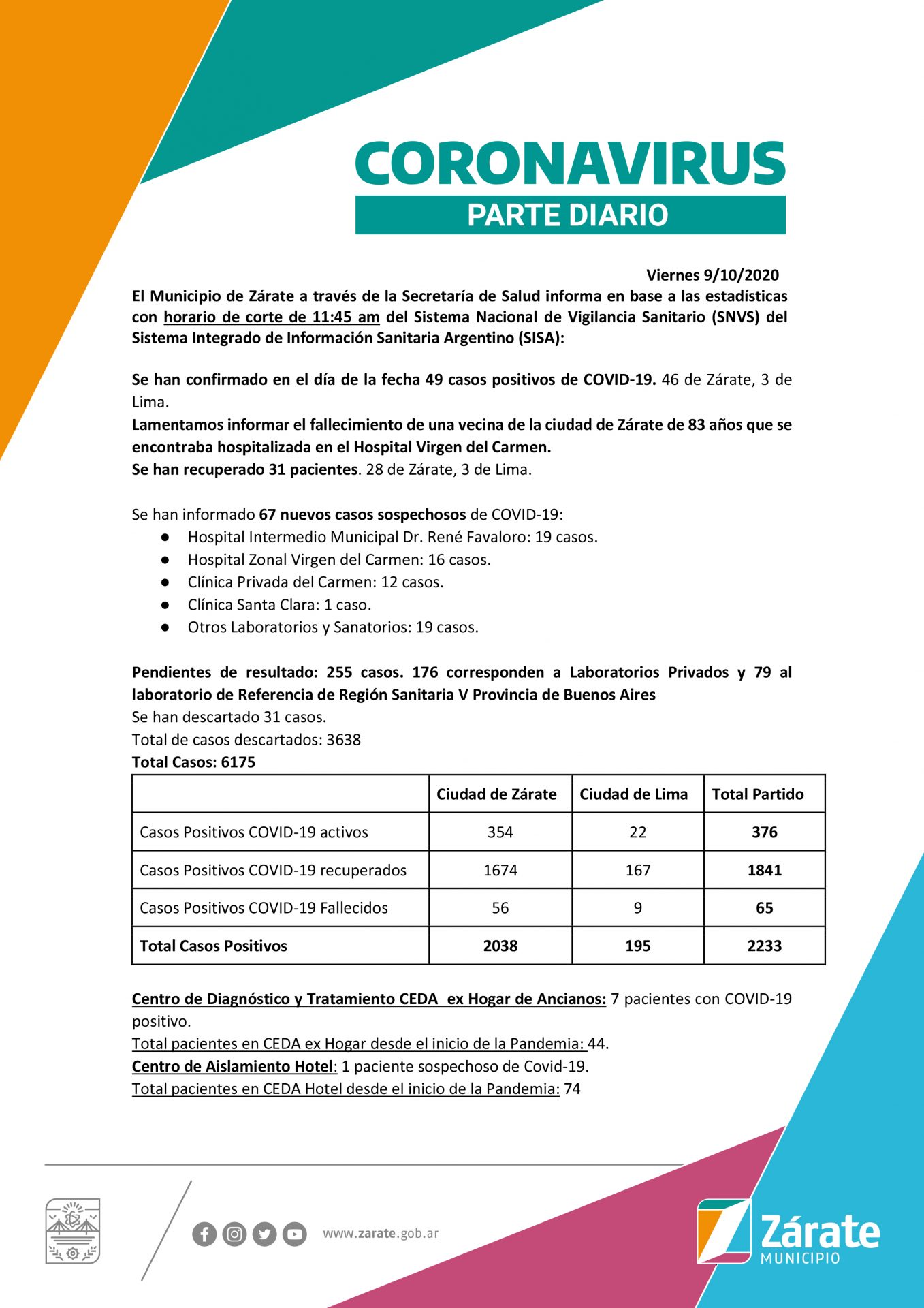 En el parte diario que fue oficialmente emitido este viernes 9 de octubre desde el Municipio de Zárate a través de la Secretaría de Salud, en base a las estadísticas del Sistema Nacional de Vigilancia Sanitario (SNVS) se comunicó que “Se han confirmado en el día de la fecha 49 casos positivos de COVID-19” y que en la fecha “falleció una vecina de la ciudad de Zárate de 83 años”, mientras que “Se han recuperado 31 pacientes” y se informaron otros “67 nuevos casos sospechosos”.