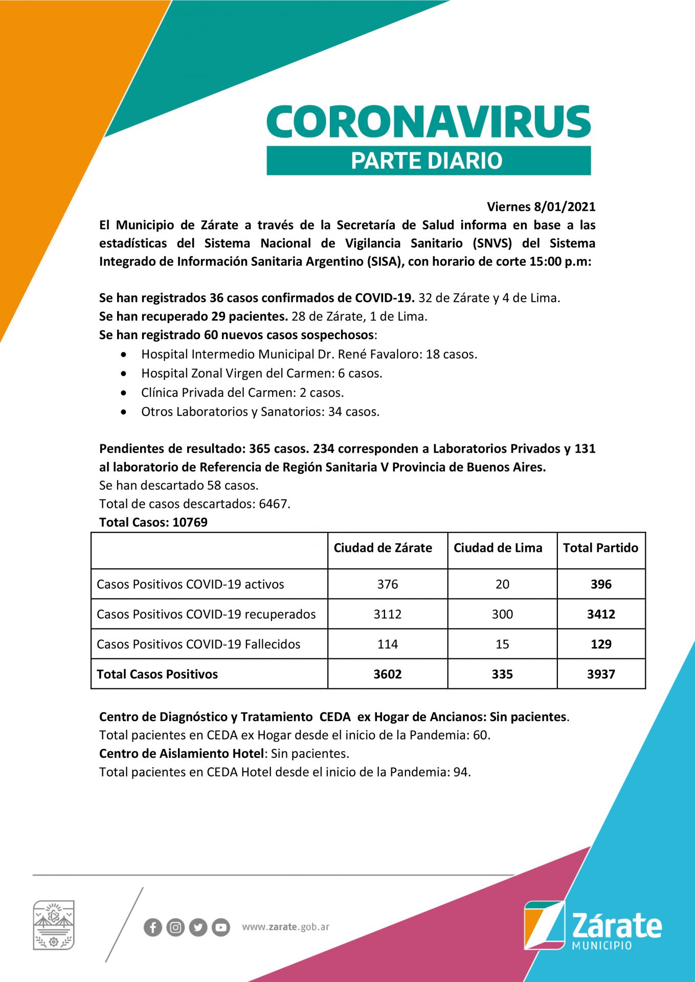 En el parte diario de este viernes 08 de enero, que entrega el Municipio de Zárate, a través de Secretaría de Salud, en base a las estadísticas del Sistema Nacional de Vigilancia Sanitario (SNVS) indica que “Se han confirmado en el día de la fecha 36 casos positivos de COVID-19”, mientras se “recuperaron 29 pacientes” y tuvimos “60 casos sospechosos”.
