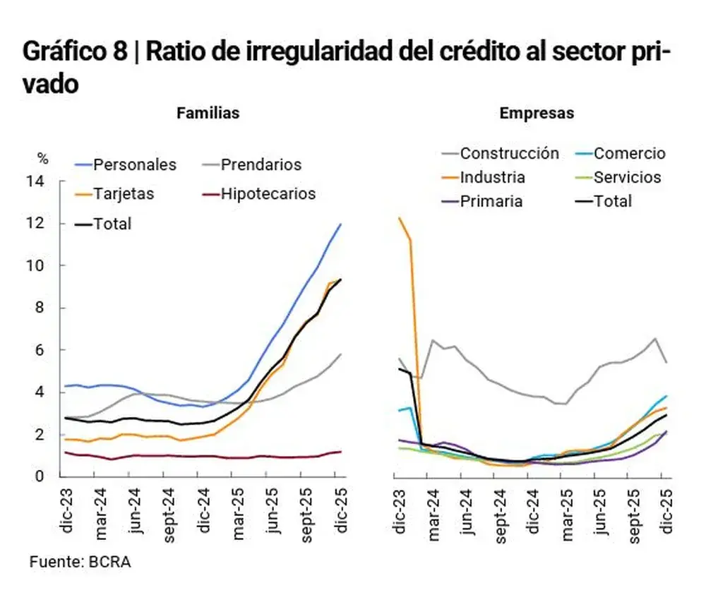 Las líneas de financiamiento vinculadas al consumo fueron las más afectadas. En los préstamos personales, la irregularidad llegó al 12%, prácticamente cuadruplicando el nivel de un año atrás, cuando se ubicaba en 3,3%. En tarjetas de crédito, en tanto, los atrasos alcanzaron al 9,3% de las financiaciones a familias, con un incremento interanual de 7,4 puntos porcentuales. Se trata de segmentos altamente sensibles a la evolución del ingreso disponible, lo que refleja la presión que enfrentaron los presupuestos familiares.