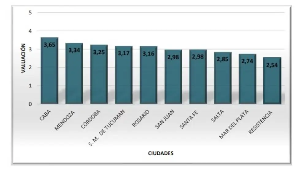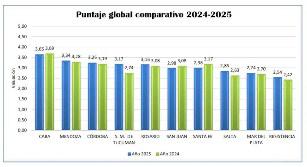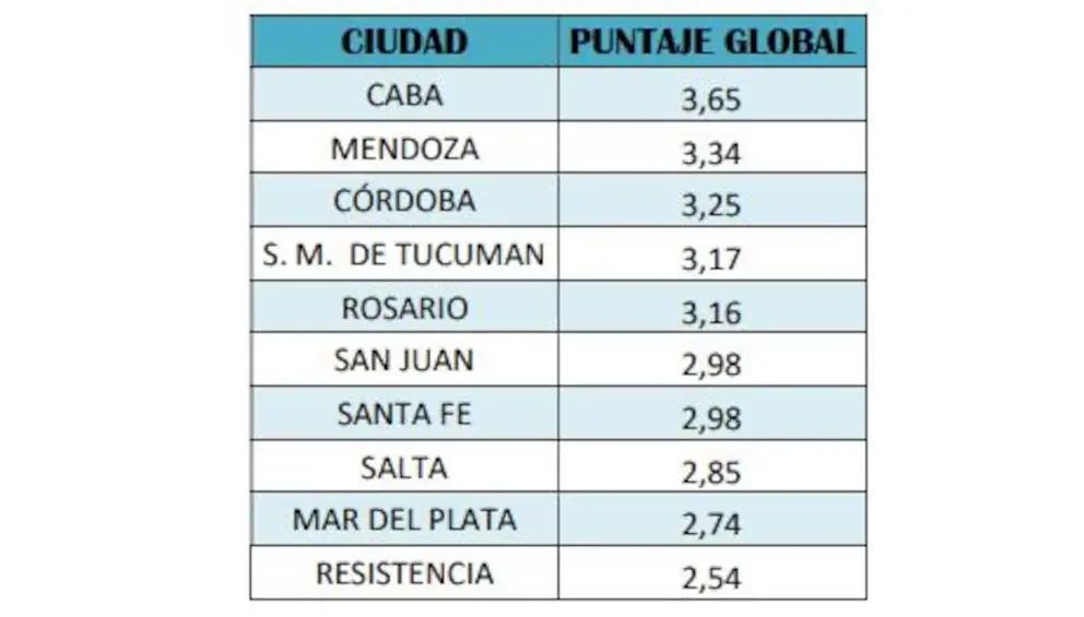 Mendoza alcanzó 3,34, seguida por Córdoba con 3,25, San Miguel de Tucumán con 3,17 y Rosario con 3,16. El ranking continúa con San Juan y Santa Fe, ambas con 2,98; Salta, 2,85; Mar del Plata, 2,74; y Resistencia, que cierra la lista con 2,54.