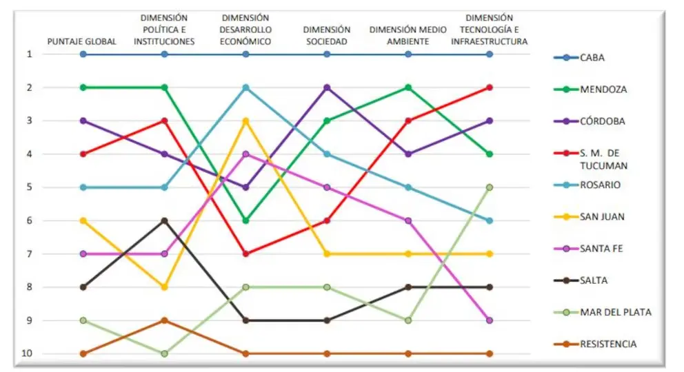 La Ciudad Autónoma de Buenos Aires mantuvo la mayor puntuación general y en cada una de las dimensiones evaluadas, con valores estables en relación al año anterior. Mendoza, Córdoba y Rosario también conservaron sus posiciones, con ligeros aumentos en sus puntajes.