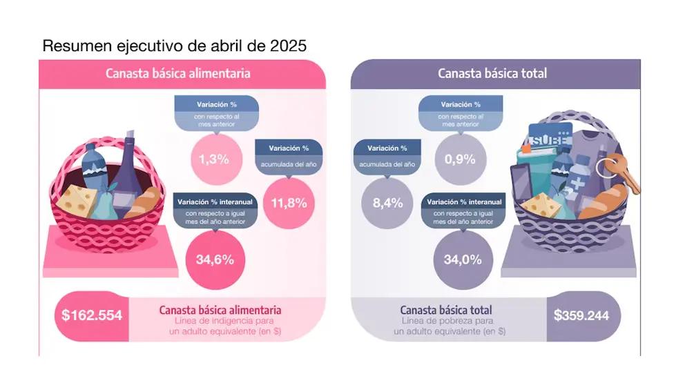 En cuanto a la canasta básica total, en abril de 2024 un adulto equivalente necesitaba $268.012 para no ser pobre, mientras que en abril de 2025 la cifra alcanzó los $359.243. Para el hogar tipo, la CBT subió desde $828.158 a $1.110.063, con una diferencia absoluta de $281.905 en un año.