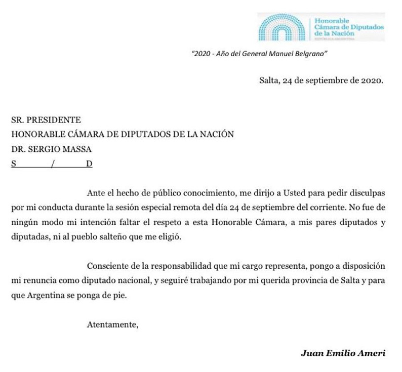 Ante el hecho de público conocimiento, me dirijo a Usted para pedir disculpas por mi conducta durante la sesión especial remota -del día de ayer-. No fue de ningún modo mi intención faltar el respeto a esta Honorable Cámara, a mis pares diputados y diputadas, ni al pueblo salteño que me eligió”, señala el texto de la renuncia enviada por Ameri a la presidencia de la Cámara.