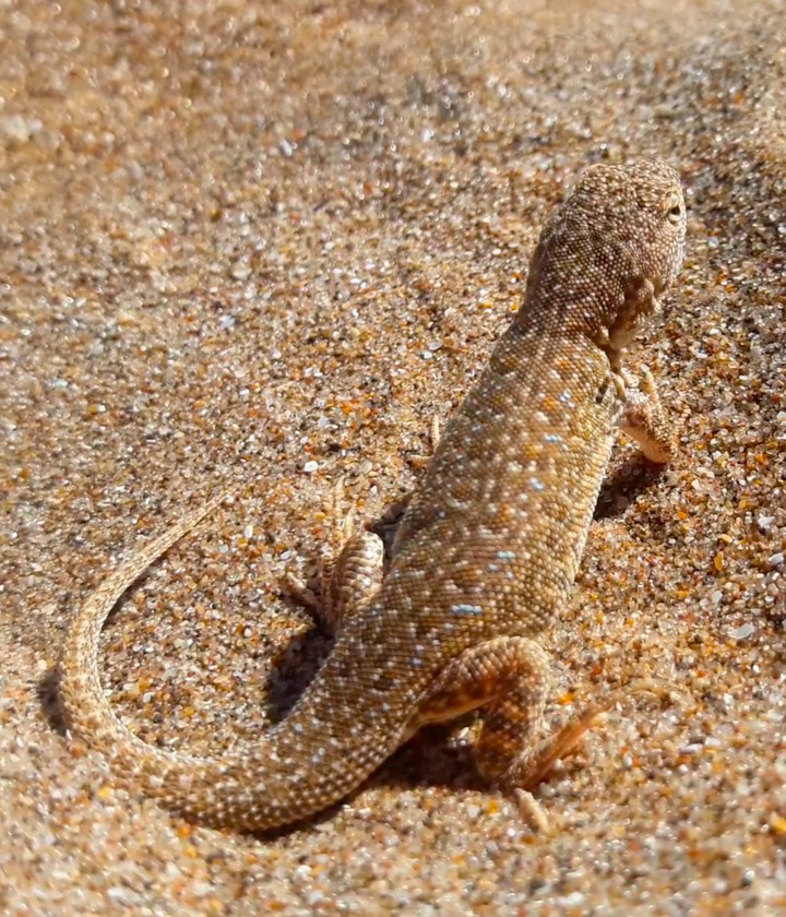La piel de este reptil se mimetiza perfectamente con el color de las dunas para poder escapar de sus predadores naturales. Sin embargo no sucede lo mismo frente a una moto, un cuatriciclo o una camioneta. Por eso los guardaparques piden a quienes circulan por la reserva que lo hagan solo por la zona media.