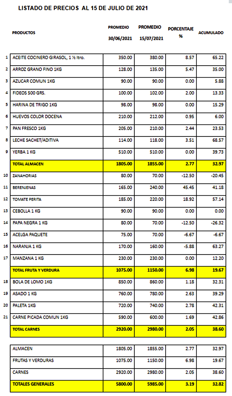 Se informó el resultado de los relevamientos de precios de 21 productos de la canasta básica de alimentos correspondientes a la primera quincena de mes de julio del año 2021, que prepara el Dr. Héctor Polino desde “Consumidores Libres” que afirma que los mismos tuvieron un aumento del 3.19 %. También el informe confirma que “LA SUMA ACUMULADA ES DEL 32.82% para el 2021.