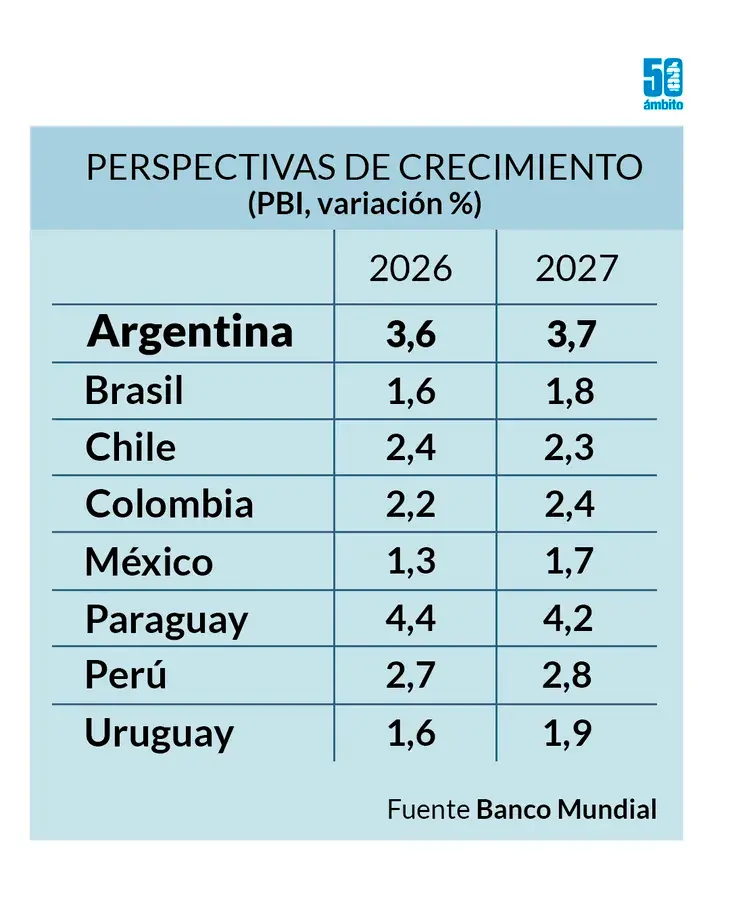 El Banco Mundial advierte sobre un crecimiento regional “limitado” al 2,1% para el año en curso, pero destaca a la Argentina “como la principal excepción al alza. El organismo anticipa un crecimiento del PBI argentino de 3,6% y 3,7% para 2026 y 2027, respectivamente.