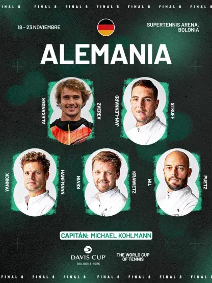 El desafío ahora será mantener el nivel ante una potencia como Alemania, que además de Zverev contará con nombres de peso en el circuito ATP como Jan-Lennard Struff, Yannick Hanfmann, Kevin Krawietz y Tim Puetz, todos ellos capitaneados por Michael Kohlmann.