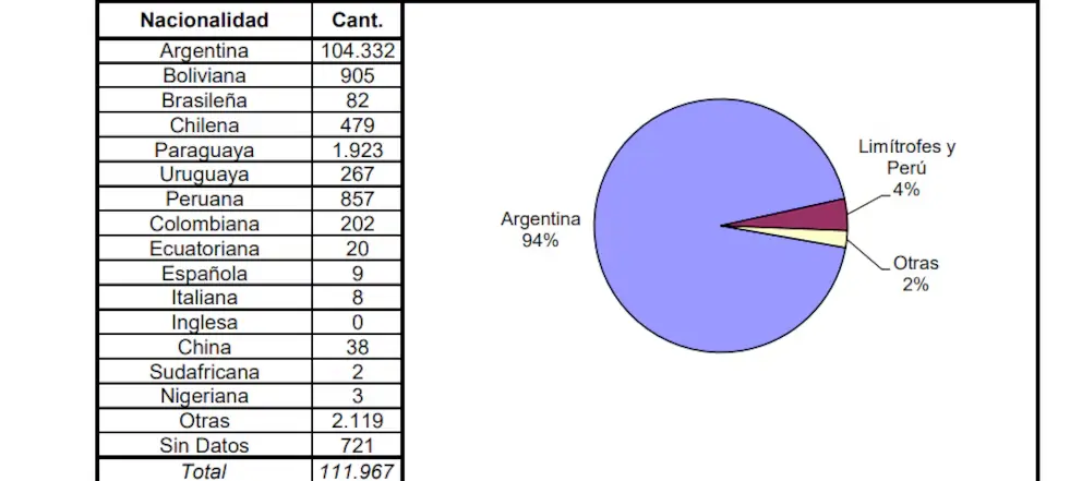 El último informa anual del Sistema Nacional de Estadísticas de Ejecución de la Pena (SNEEP) informa que la población carcelaria hasta el 31 de diciembre de 2023 era de 111.967 personas, siendo extranjera el 6% del total (6644 personas). El 4% está compuesta por países limítrofes y Perú. De este grupo, 1923 personas son de Paraguay, 905 de Bolivia y 857 de Perú.