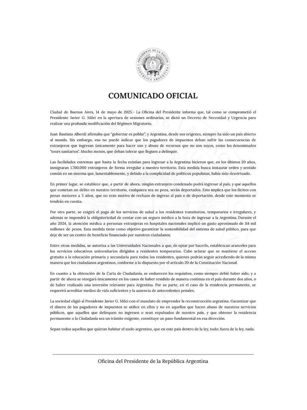 A través de un mensaje del vocero presidencial, Manuel Adorni, el Gobierno anunció el lanzamiento de su propia reforma migratoria, la cual se hará efectiva a través de un Decreto de Necesidad y Urgencia en el Boletín Oficial en los próximos días.