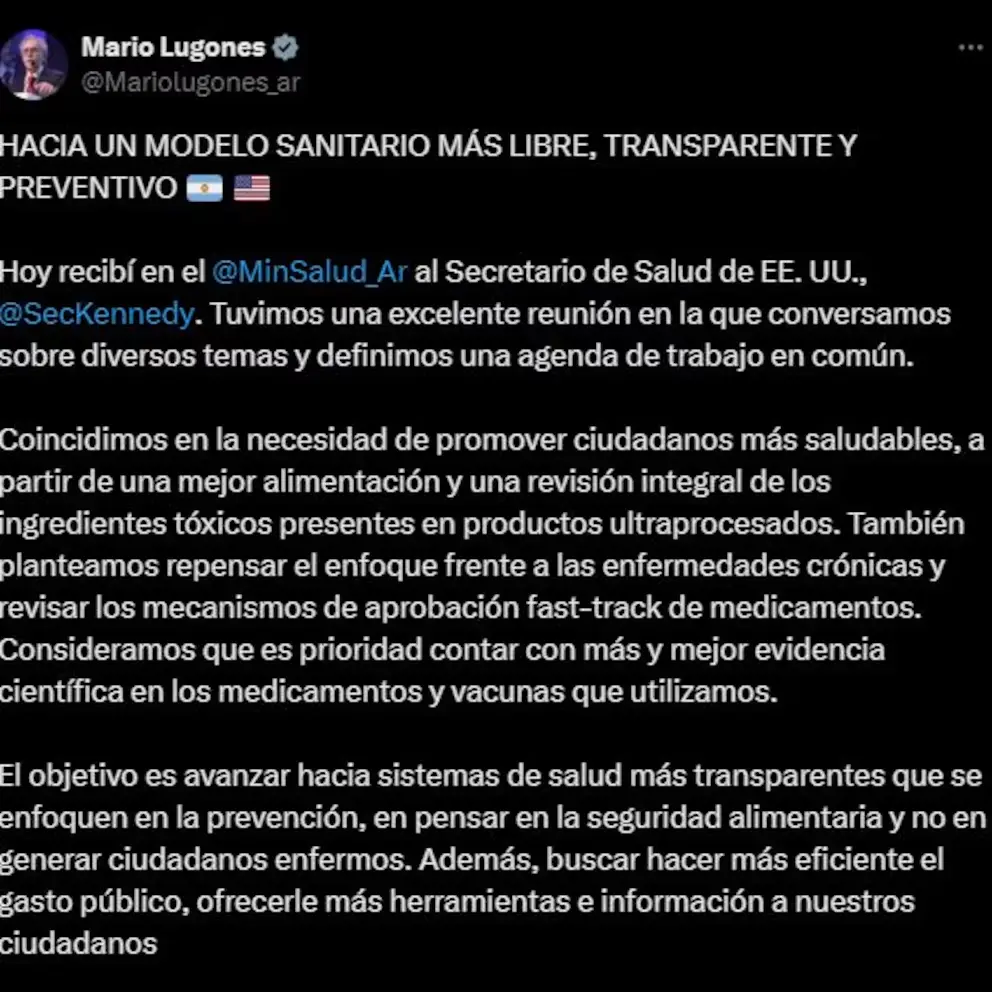 “Hacia un modelo sanitario más libre, transparente y preventivo”, escribió Lugones tras el encuentro ayer con Kennedy Jr.: “Tuvimos una excelente reunión en la que conversamos sobre diversos temas y definimos una agenda de trabajo en común”.