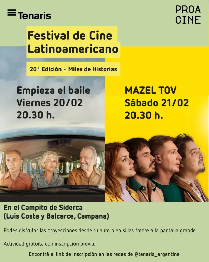 Tenaris y PROA Cine celebran la 20ª edición del Festival de Cine Latinoamericano, una iniciativa que desde hace dos décadas acerca a la comunidad lo mejor de la producción cinematográfica regional. En esta oportunidad, el Festival tendrá lugar el viernes 20 y sábado 21 de febrero en el Campito de Siderca de Campana, a partir de las 20:30, con entrada gratuita e inscripción previa.