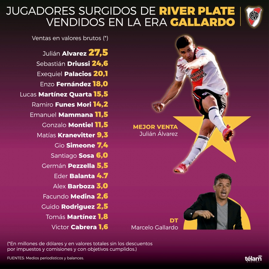 El proceso de Marcelo Gallardo en River, iniciado en junio de 2014, pobló las vitrinas del club con el mismo vigor que generó ingresos brutos por transferencia de derechos económicos de futbolistas surgidos en las divisiones inferiores, una cifra que se elevó esta semana a 187,3 millones de dólares tras la venta de Enzo Fernández a Benfica de Portugal