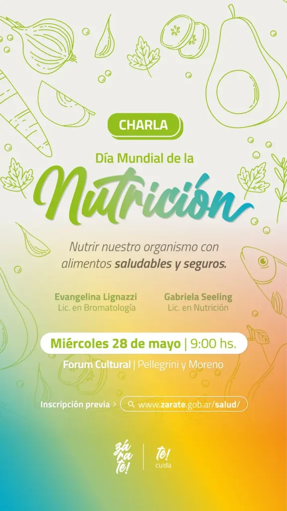 El Municipio de Zárate convoca a toda la comunidad a participar en una charla conmemorativa por el Día Mundial de la Nutrición, programada para este miércoles 28 de mayo a las 09:00, en el Forum Cultural (ubicado en Pellegrini y Moreno). La cita estará centrada en explorar estrategias y consejos prácticos que permitan nutrir el organismo con alimentos saludables y seguros.
