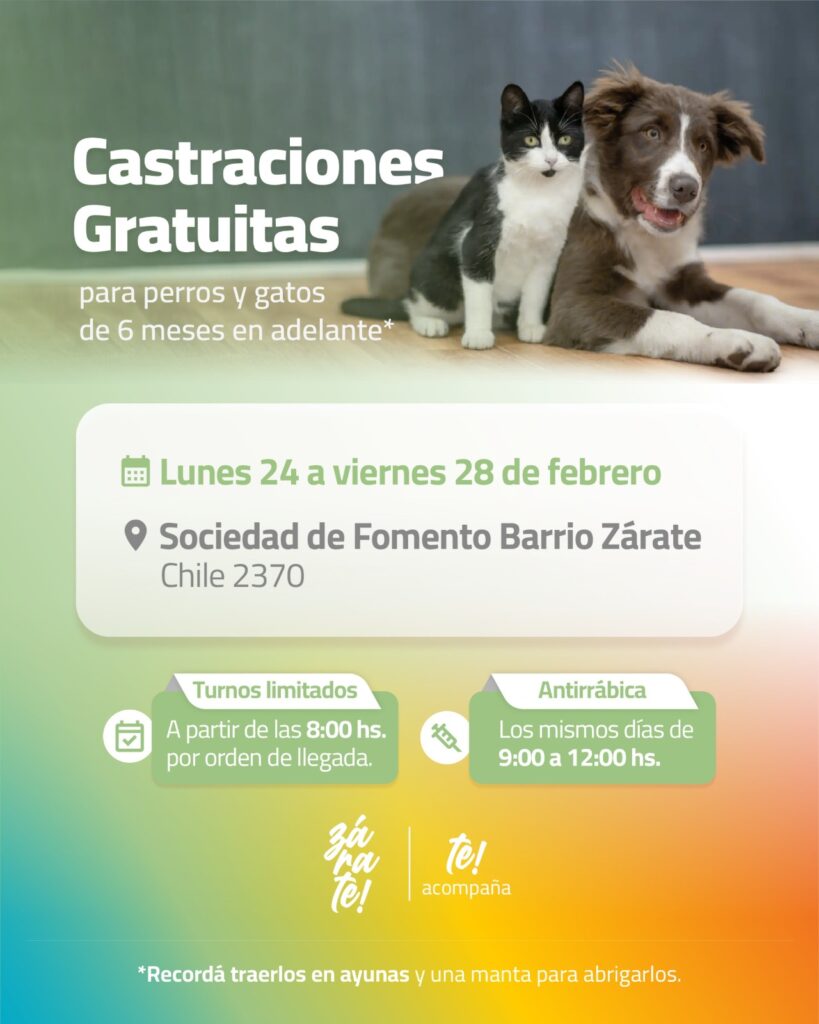 Asi se informó el cronograma de las castraciones para la Próxima Semana los operativos de castración se realizarán desde el lunes 24 hasta el viernes 28 de febrero en la Sociedad de Fomento de Barrio Zárate (Chile 2370).