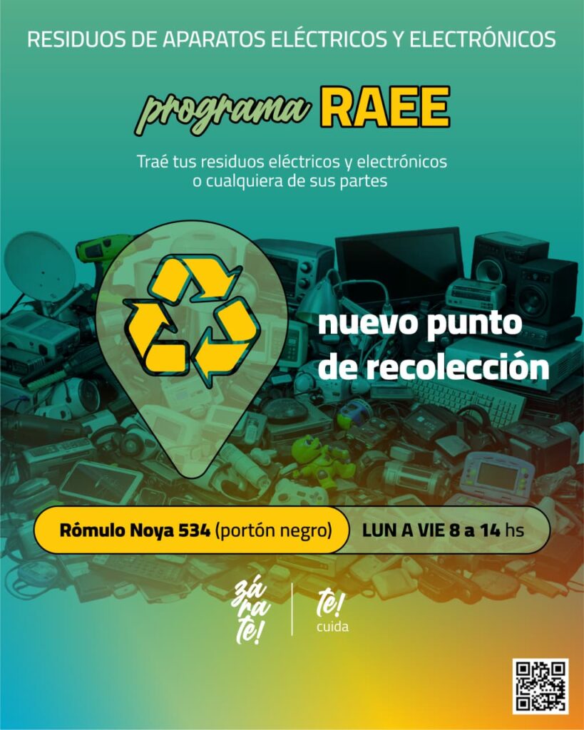 El punto de recepción funciona en R. Noya Nº 534 (portón negro) y atenderá de lunes a viernes, de 8 a 14 horas. Allí los vecinos podrán llevar sus Residuos de Aparatos Eléctricos y Electrónicos (RAEE), como parte de una política pública que busca garantizar la correcta gestión de este tipo de materiales.