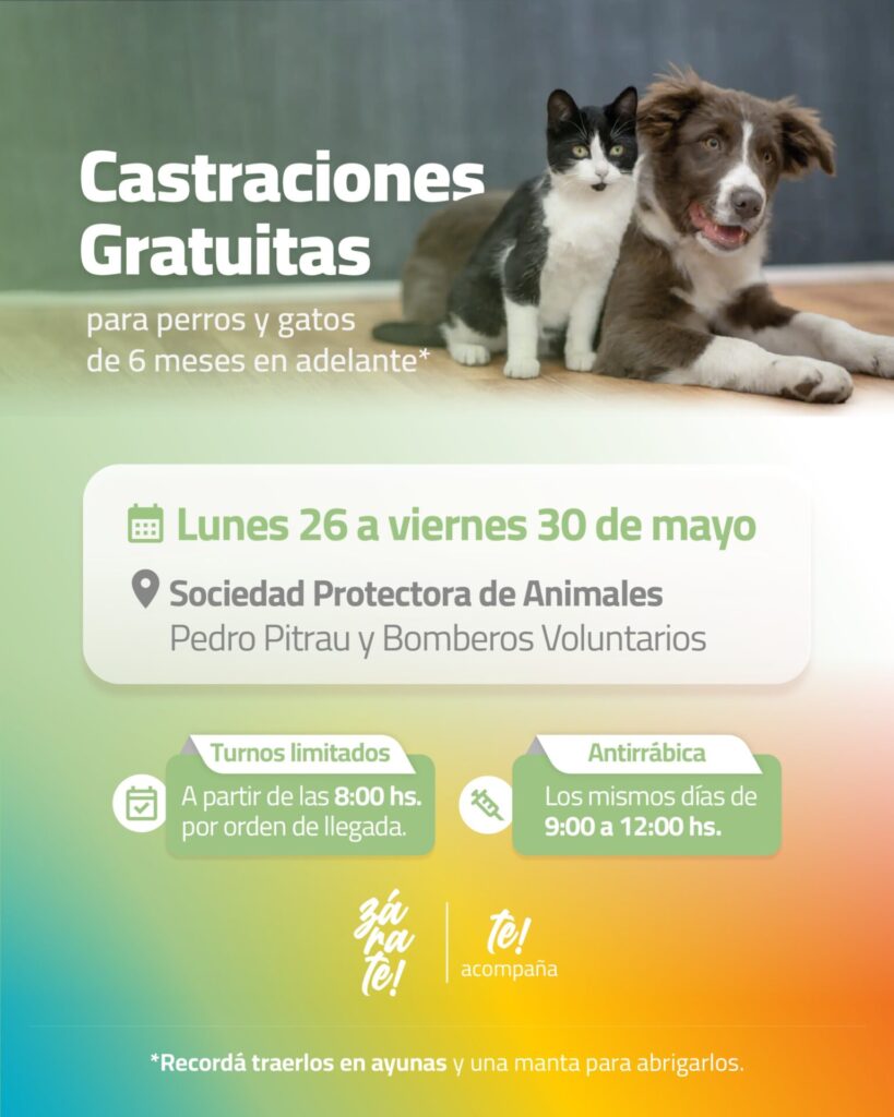 El Municipio de Zárate, a través de la Dirección de Castraciones, sigue impulsando su compromiso con la salud animal al reanudar el programa de castraciones gratuitas dirigido a perros y gatos mayores de seis meses. El operativo abarca animales de todas las tallas, incluyendo hembras preñadas o en celo, gatas transcurridos 30 días desde el parto y perras a los 60 días post-parto. Las intervenciones se llevarán a cabo en las sedes de Pedro Pitrau y Bomberos Voluntarios, sede de la Sociedad Protectora de Animales de Zárate, desde el lunes 26 hasta el viernes 30 de mayo.