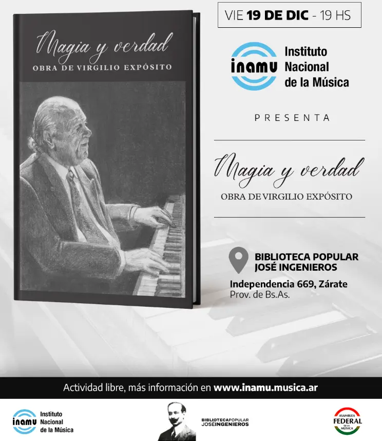 Este viernes 19 de diciembre a las 19 h, Zárate recibe una presentación muy especial: el Instituto Nacional de la Música (INAMU) presenta el libro Magia y verdad. Obra de Virgilio Expósito en la Biblioteca Popular José Ingenieros (Independencia 669). La entrada es libre y gratuita.