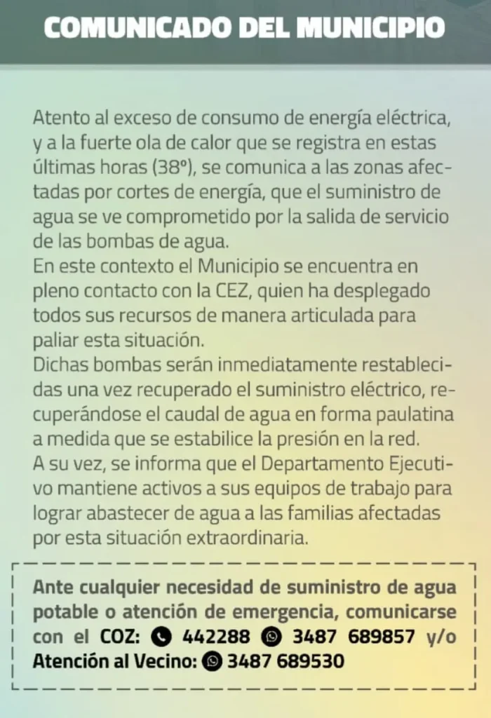 Sin embargo, el contexto se agrava por una situación que afecta directamente a numerosos vecinos: desde hace más de 24 horas, varios barrios permanecen sin suministro eléctrico y sin agua corriente, generando un fuerte malestar que se expresa en redes sociales y en reclamos comunitarios.