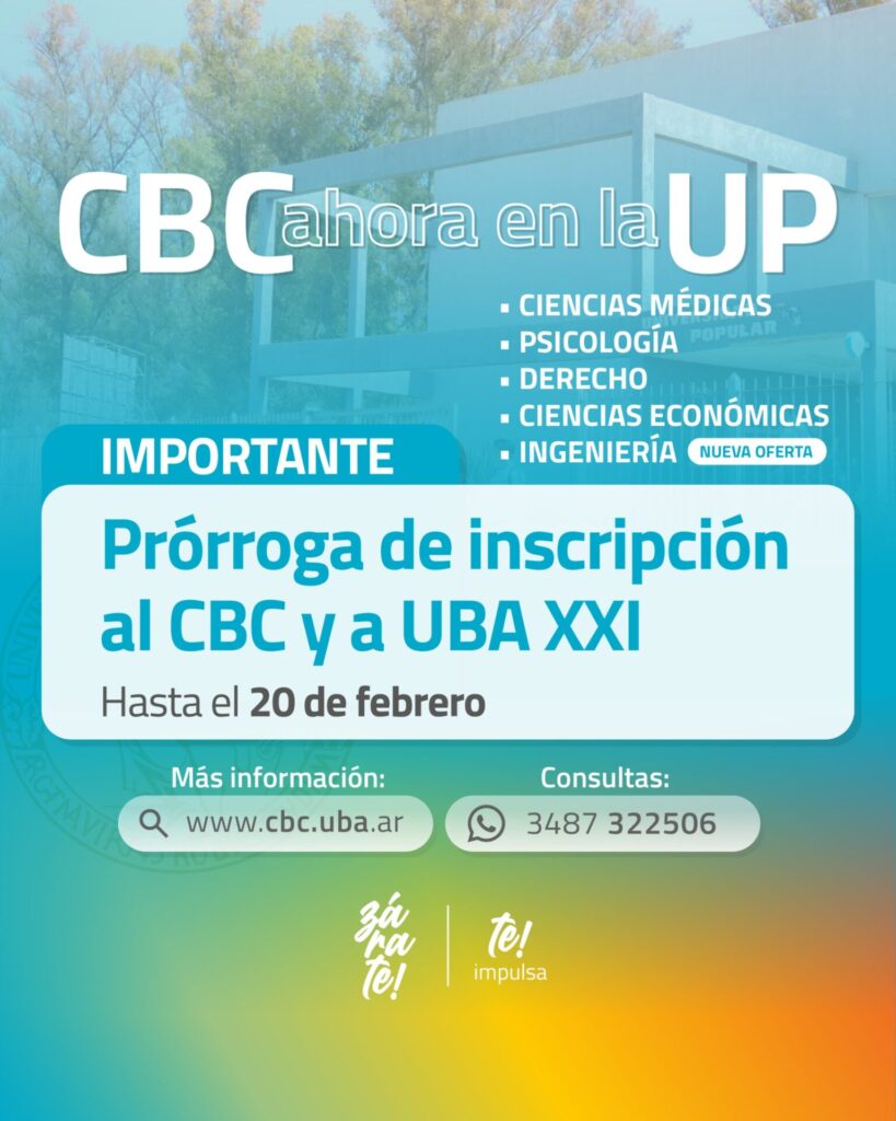 Es para el ingreso al Ciclo Básico Común o a UBA XXI del ciclo lectivo 2025 dode se agotan los tiempos ya que la Universidad de Buenos Aires extendió la inscripción a todas sus carreras hasta el 20 de febrero inclusive. La misma se llevará a cabo de forma virtual ingresando a la página www.uba.ar o bien desde las webs del CBC, www.cbc.uba.ar y UBA XXI, www.ubaxxi.uba.ar