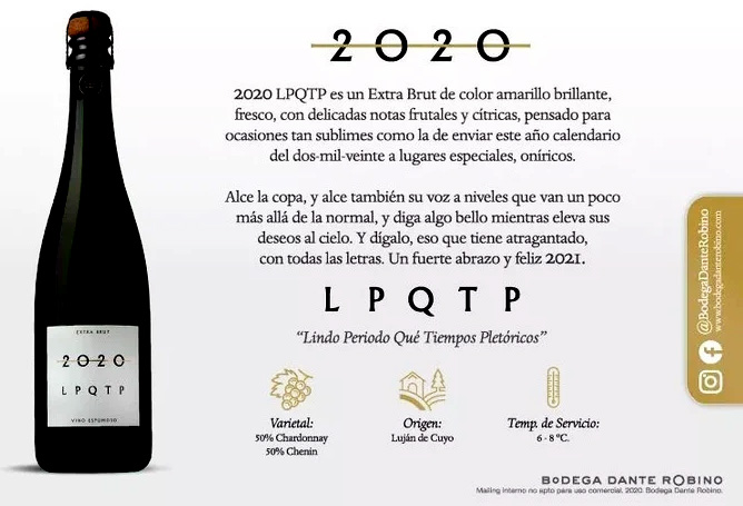 Seguramente, viste la propaganda “champú” de prestigiosa bodega: “2020 LPQTP” -ver al pie de la columna-, con las cinco letras (insulto) que describen el mal humor de la gente; seguramente aparecerán más testimonios de otras cosas, más allá de los Nemes, qué recordarán este año, como uno de los años más complicados para toda la humanidad.