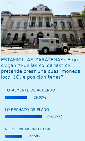 Esta semana, en nuestro portal www.eldebate.com.ar pusimos a consideración una encuesta que daba cuenta sobre las famosas estampillas zarateñas que, bajo eslogan “huella solidaria” se pretende crear, o tal vez ya, se pretendía crear como una cuasi moneda local.
