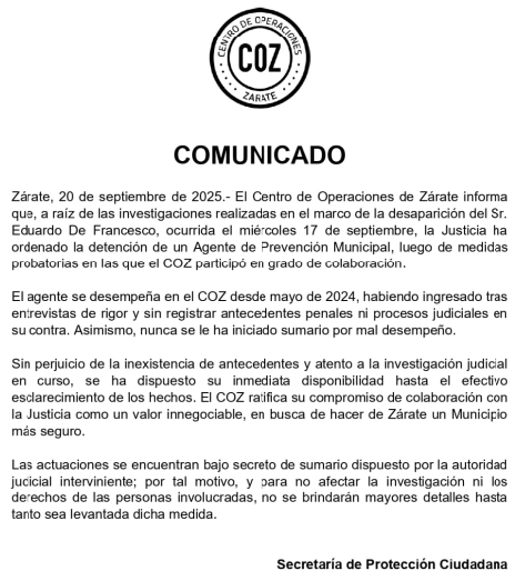Mientras la justicia avanza con celeridad para esclarecer el paradero de De Francesco, quien habría sido abordado por uno o dos vehículos privados, descartando que se trate ni de un movil policial de la Bonaerense ni del COZ, en la esquina de su vivienda, Multimedios EL DEBATE considera fundamental poner en conocimiento público el comunicado institucional emitido por el COZ, en el marco de una causa que conmueve a la comunidad.